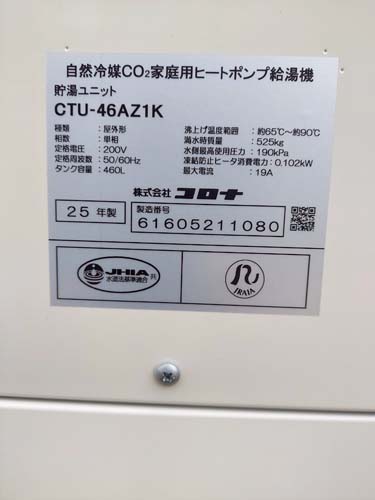 佐世保市島瀬町 コロナ自然冷媒CO2家庭用ヒートポンプ給湯機 ヒートポンプユニットCHP-DZ601K、貯湯ユニットCTU-46AZ1K エコキュート交換工事